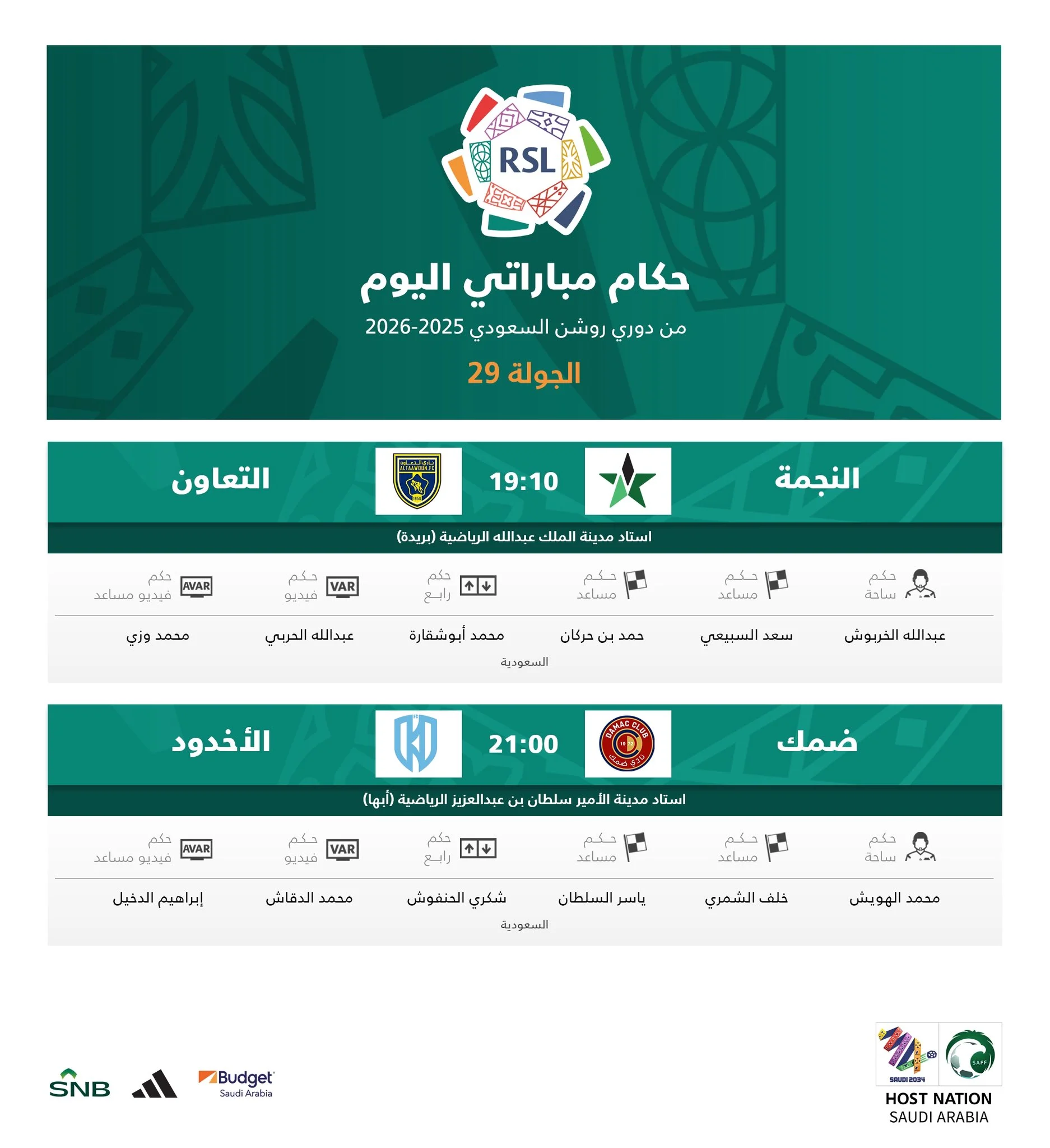 وتشهد الجولة 29 من الدوري السعودي اهتمامًا واسعًا من الجماهير نظرًا لأهمية المباريات وتأثيرها على ترتيب الفرق في جدول الترتيب حيث تظل قرارات الحكام عاملًا مهمًا في حسم نتائج اللقاءات وسط متابعة دقيقة من الجماهير ووسائل الإعلام الرياضية.
