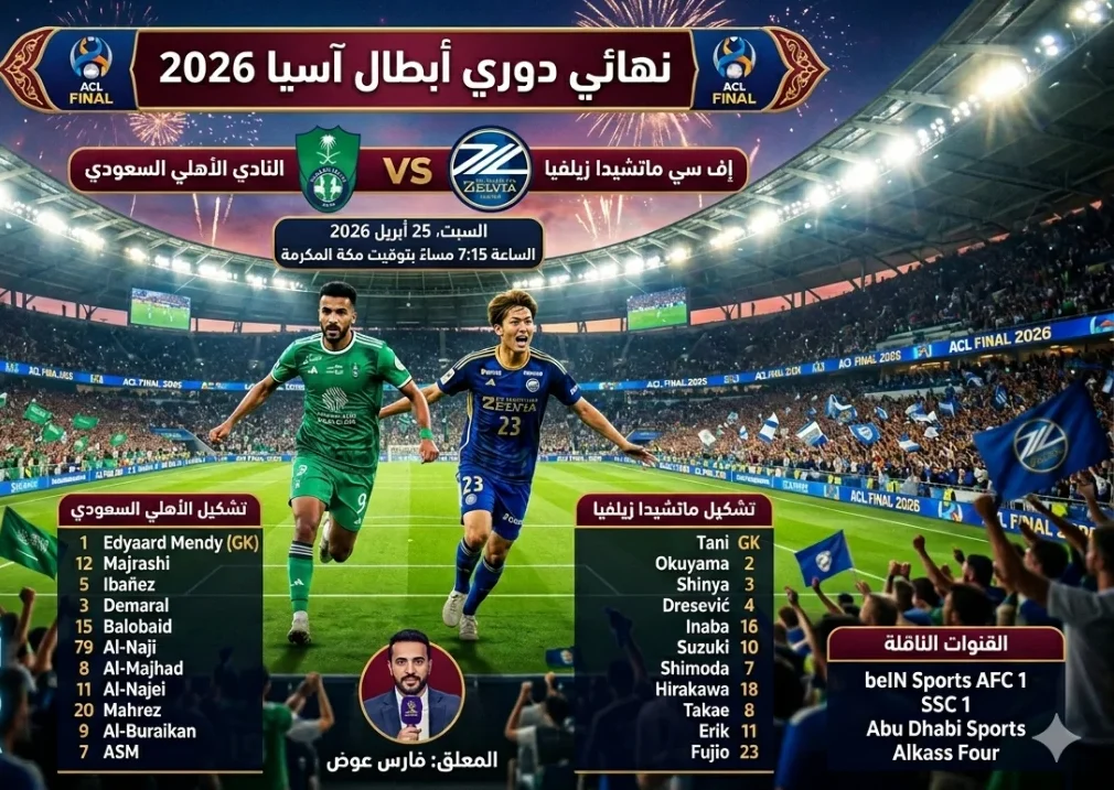 نهائي آسيا 2026 يشتعل.. مواجهة الأهلي السعودي وماتشيدا زيلفيا – كل ما تريد معرفته عن التشكيل والقنوات والمعلق