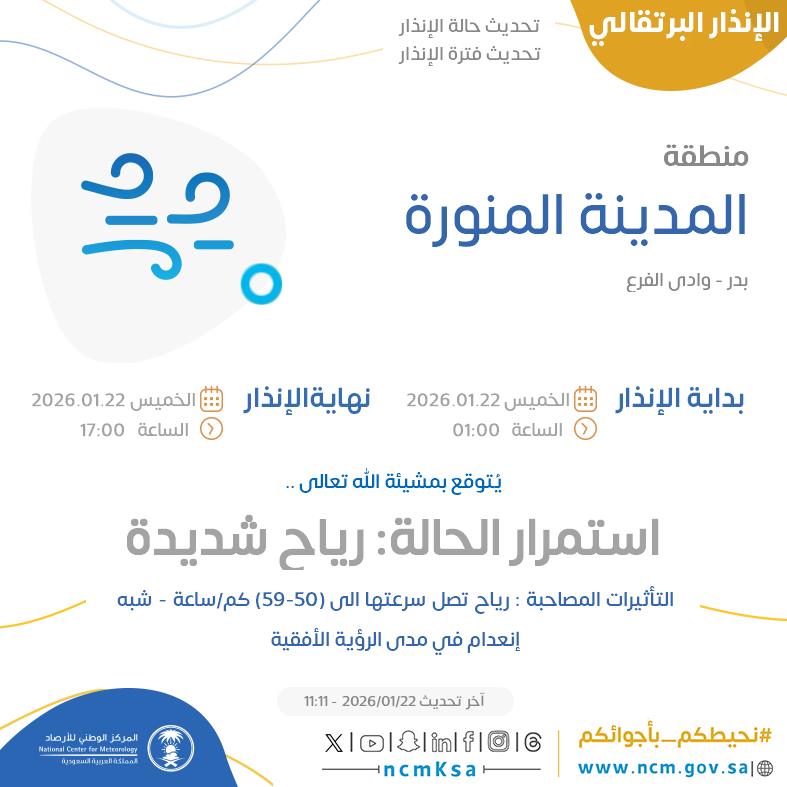 أوضح المركز الوطني للأرصاد أن حالة الطقس في السعودية اليوم تتطلب توخي الحيطة والحذر، خاصة في مناطق مكة المكرمة والمدينة المنورة، حيث تتكون سحب ضبابية خلال ساعات الليل والصباح الباكر تؤدي إلى انخفاض كبير في مستوى الرؤية الأفقية، بالتزامن مع رياح نشطة قد تعيق حركة السير، كما تتأثر الطرق السريعة خارج النطاق العمراني بموجات من الغبار الكثيف.