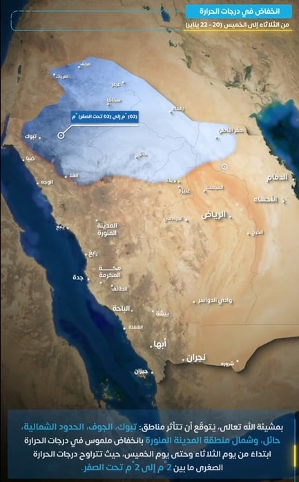 ستشمل تأثيرات الموجة الباردة مناطق واسعة من المملكة؛ حيث يمتد انخفاض درجات الحرارة إلى الرياض، والشرقية، والقصيم يومي الأربعاء والخميس، مع تسجيل حرارة تتراوح بين 1 و4 درجات تحت الصفر، كما سينشط الرياح المثيرة للأتربة والغبار على الحدود الشمالية والجوف من مساء الثلاثاء، وتمتد لاحقًا لتشمل نجران، الشرقية، الرياض، القصيم وحائل، ما يزيد من الإحساس بالبرودة ويستدعي الحذر أثناء التنقل.