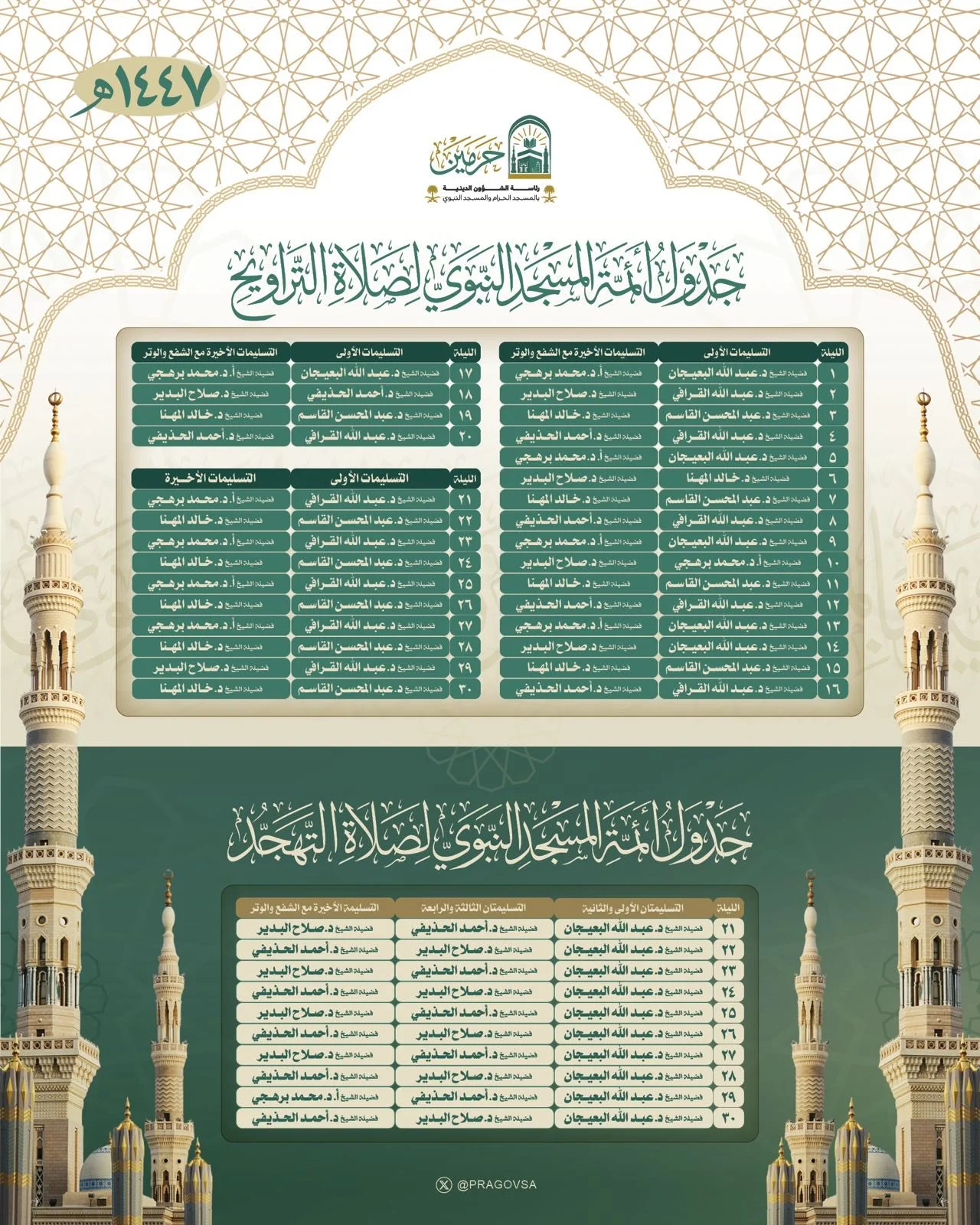 لم يقتصر الإعلان على المسجد الحرام فقط، بل شمل أيضًا جدول صلاتي التراويح والتهجد 1447 في المسجد النبوي الشريف، حيث تم تحديد قائمة من الأئمة الأفاضل الذين سيتولون إمامة المصلين خلال شهر رمضان، مع توزيعهم على ثلاثين ليلة بشكل منظم يراعي التوازن والاستمرارية في الأداء.