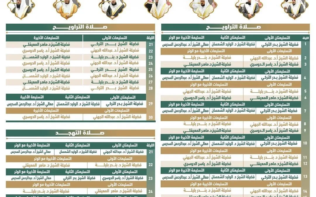 أوضحت رئاسة الشؤون الدينية أن جدول صلاتي التراويح والتهجد يعتمد على الترتيب الزمني للأئمة والمؤذنين لضمان انسيابية الصلاة وتوفير أجواء روحانية للمصلين، ويتيح الجدول أداء الصلوات في أجواء من الطمأنينة والخشوع، كما يساهم في تنظيم حركة الزوار والمعتمرين داخل المسجد الحرام دون تكدس أو فوضى، ويشمل الجدول ما يلي: