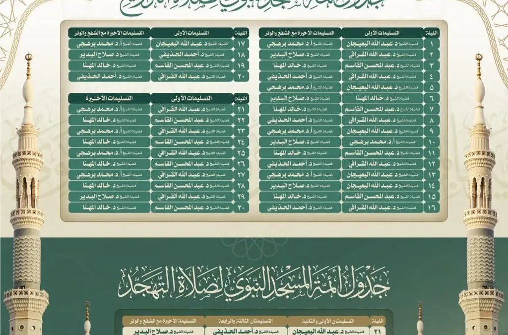 جدول صلاتي التراويح والتهجد بالمسجد النبوي والخدمات التنظيمية